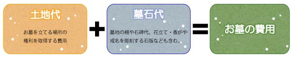 お墓を建てる際の費用として基本的に考えられるものは、「土地代」と「墓石代(ぼせきだい)」です。「土地代」は、お墓を建てる場所を使用する権利を取得する為の費用で「永代使用料」や「墓地使用料」といいます。この土地代はお求めになる墓地の地域・大きさにより価格が異なります。